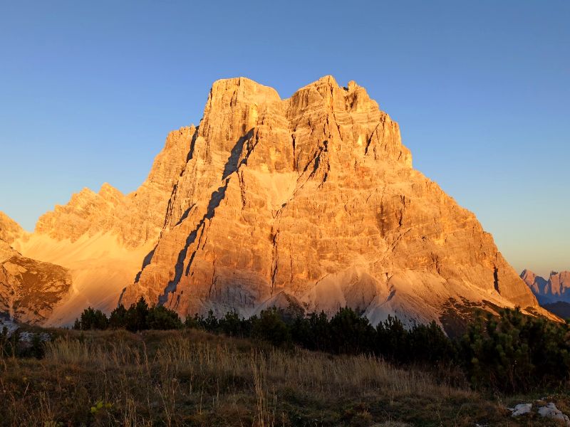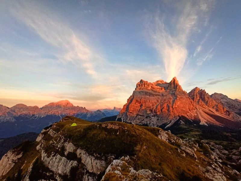 Qualche anno fa ho piantato la tenda sulla pala adiacente alla croce di vetta e lo spettacolo che ho vissuto quando il buio ha lasciato spazio alla luce è stato straordinario. Alcune nuvolette sulle cime Friulane si erano “incendiate” facendomi fare i salti di gioia per l’esperienza che stavo vivendo. In seguito, il Pelmo si è illuminato lentamente mostrando la sua faccia più bella, quella dove l’enrosadira lo scalda e lo veste con eleganza prima dell’inizio della giornata.